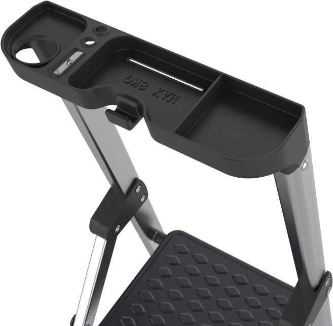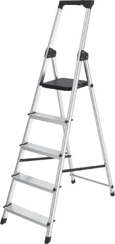 - Uit aluminium Onderste treden: 8 cm breed, bovenplateau (uit staal): 25 x 25 cm (met antislipmat) Draagvermogen: 150 kg Antislipvoetjes Kleur: zilver-zwart Warenwet gecertificeerd 5 treden, gewicht: 4,7 kg