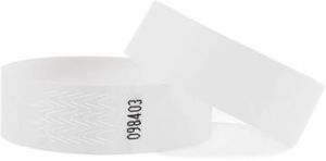- Tyvek polsbandjes Zowel voor volwassenen als kinderen Voorzien van een doorlopende nummering Met sterke plakstrook Met watervaste viltstift of pen te beschrijven Ft 1,9 x 25 cm Pak van 100 stuks wit