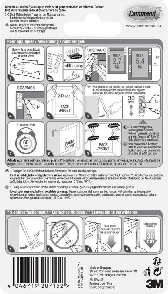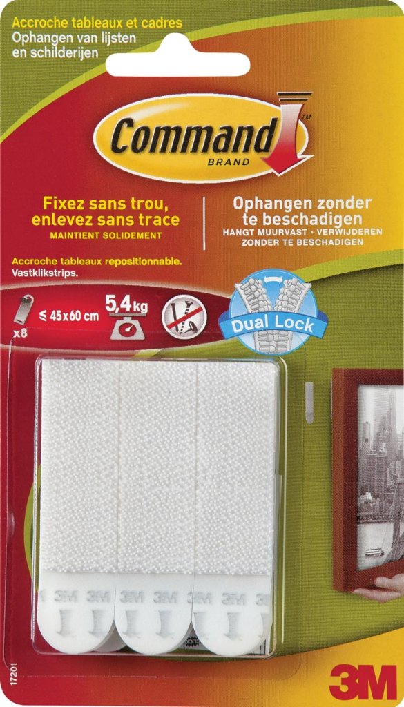 - Herbruikbare bevestigingsstrips om producten opnieuw op te hangen, om schoon te maken, de kamer opnieuw in te richten of een object een andere plek te geven