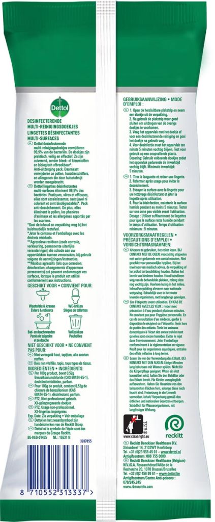 - Doekjes voor meerdere oppervlakken die 99,9% van de bacteriën, sommige virussen en 90% van de allergenen verwijderen