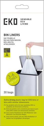 - Uit extra sterke plastic Geschikt voor EKO afvalbakken of prullenbakken met vergelijkbare afmetingen Voorzien van handige trekband voor het makkelijk sluiten en dragen van de vuilniszak Kleur: wit inhoud: 3-6 l, type A, pak van 30 stuks