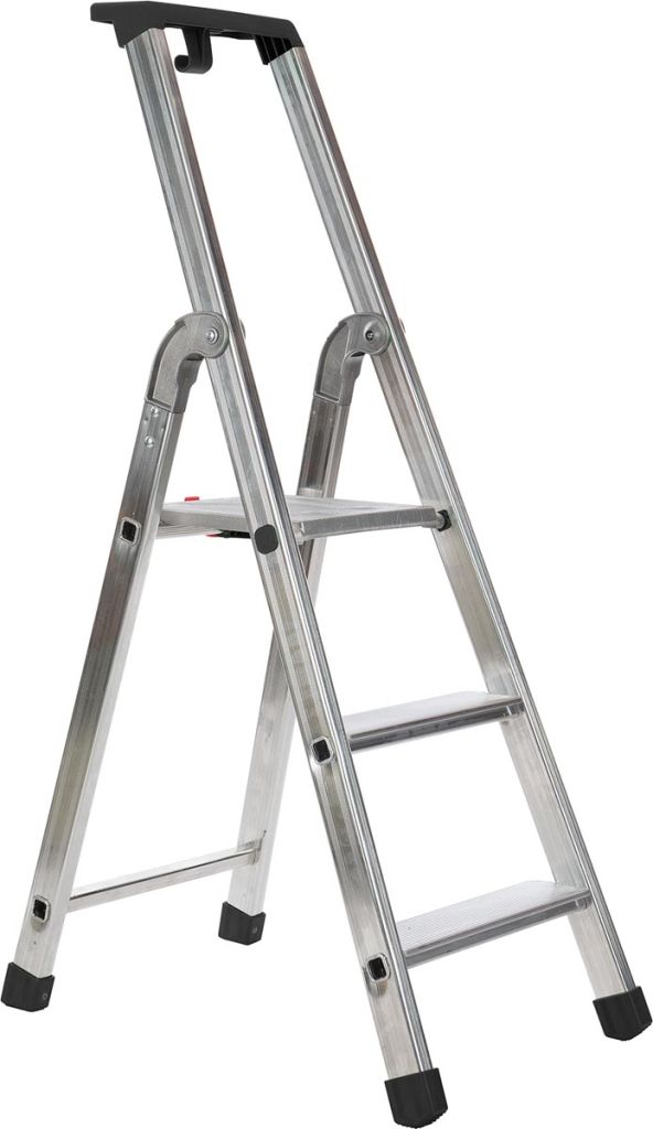 - Industriële aluminium trapladder Antislipplatform met automatische vergrendeling Ultra stevig: platform en scharnieren in gegoten aluminium Extra brede antisliptreden in aluminium: 8,5 cm Vierkante felsing van de treden dwars door het profiel voorkomthet ronddraaien van de treden Handige gereedschapshouder met haak Draagkracht : Max