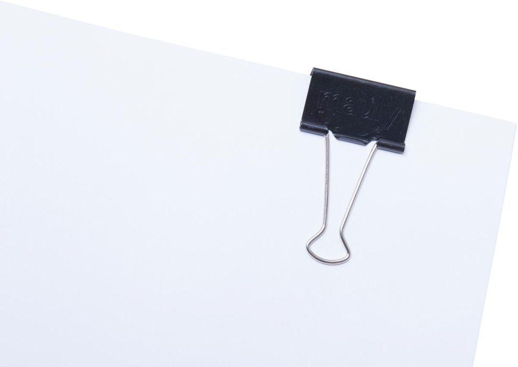 - Open de papierklem door de metalen beugels naar achteren te klappen en samen te knijpen, sluiten van de klem door de beugels weer los te laten en eventueel naar voren klappen