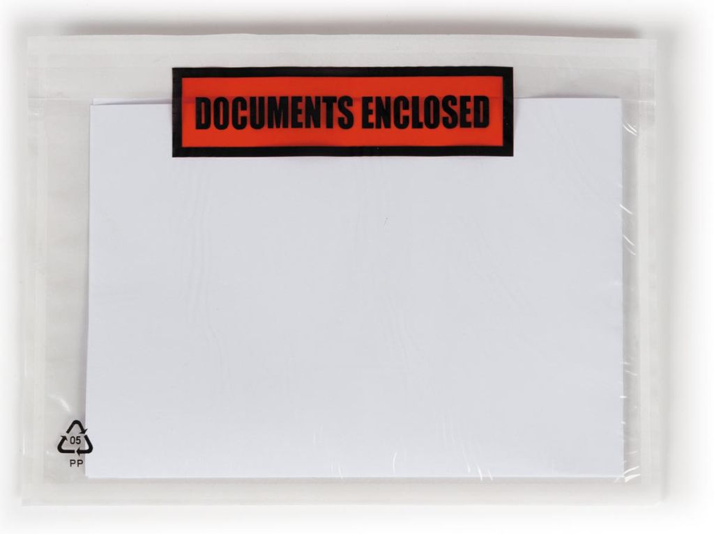 - Uit plastic Zelfklevend Om documenten aan een verzendlading te bevestigen Transparant ft 165 x 115 mm (A6), buitenmaat: 175 x 135 mm, doos van 1000 stuks, documents enclosed