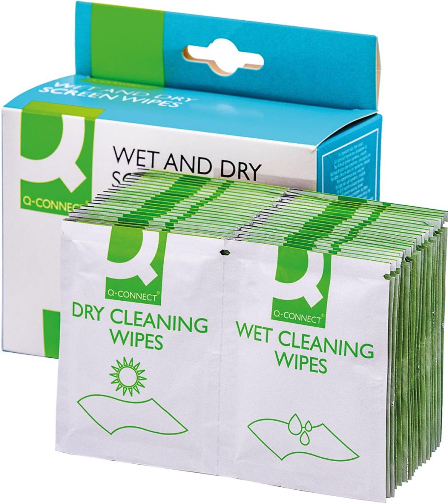 Q-CONNECT Wet & Dry beeldschermreinigingsdoekjes, doos van 20 paar (1 Wet en 1 Dry)