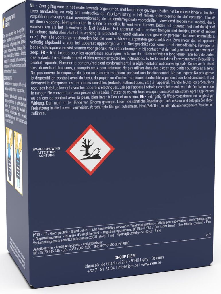 - Niet voor verkoop in Nederland Tegen gewone, tijger- en gelekoortsmuggen Geurloos Vervaldatum: 5 jaar na productie Inhoud: toestel + 10 tabletten