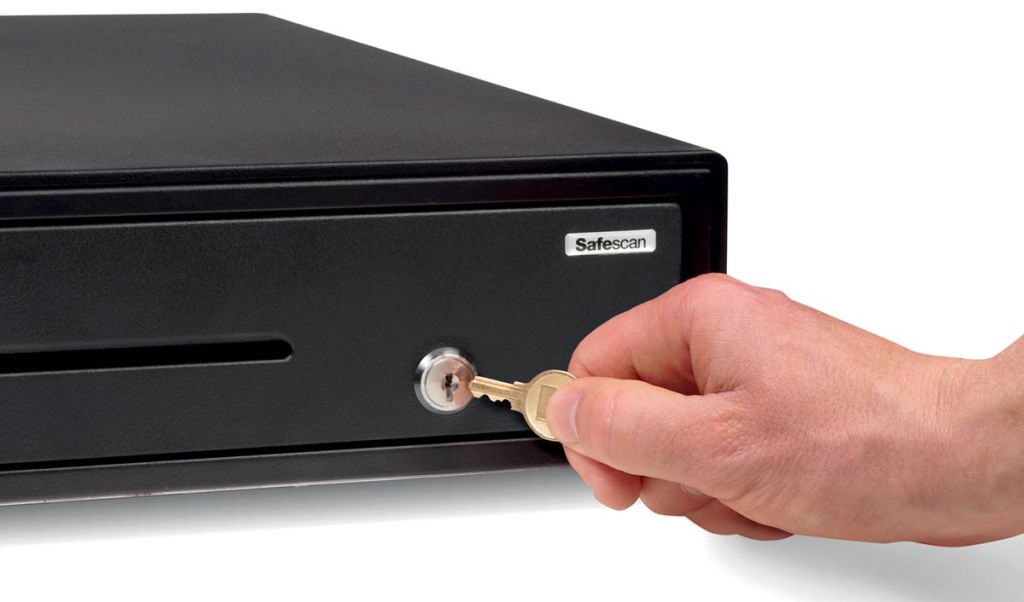 - Open de kassalade door eenvoudig de sleutel om te draaien, of sluit hem aan een RJ12 bonprinter of kassasysteem aan voor automatisch openen