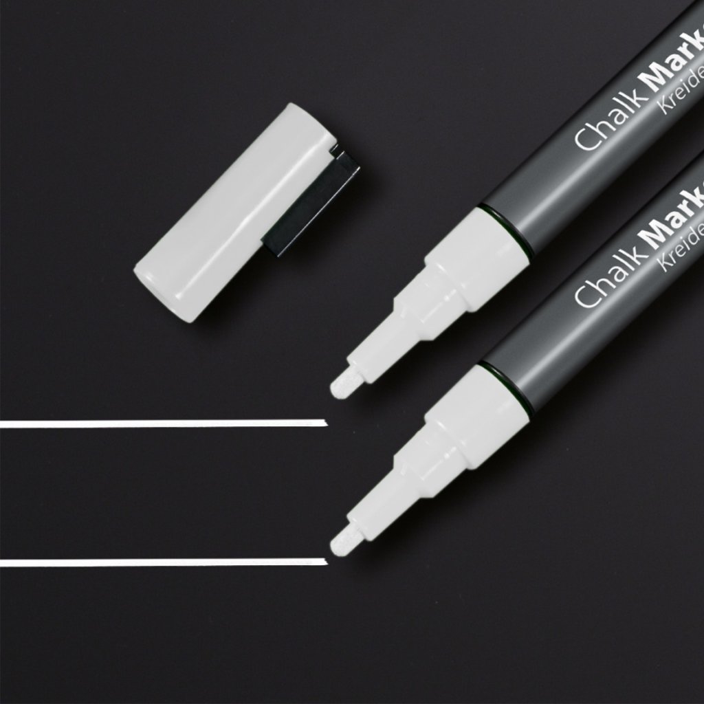 De witte krijtstiften zijn door hun ronde punt zeer geschikt voor fijne lettertypes (1-2 mm lijndikte). Ze schrijven perfect op glas en alle gladde, op glas lijkende oppervlakken, bijv. op glas-magneetborden, etalages of spiegels. Het vloeibare krijt op waterbasis dekt bijzonder goed. Het is daardoor geschikt voor alle lichte en transparante oppervlakken en is restvrij droog en ook vochtig schoon te vegen. Gebruik gewoon de speciaal ontwikkelde delta-microvezeldoek of de bordenwisser van Sigel.
