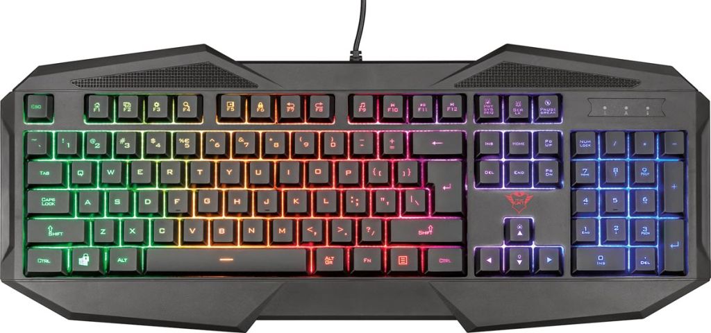 - Toetsenbord: - Met draad - Verlicht toetsenbord met regenboogeffect Muis - Met draad - Zowel voor rechts- als linkshandigen - Met kleurrijk LED-ontwerp Muismat: - Met geoptimaliseerde oppervlaktestructuur Headset: - Aanpasbare hoofdband - Krachtig geluid qwerty toetsenbord