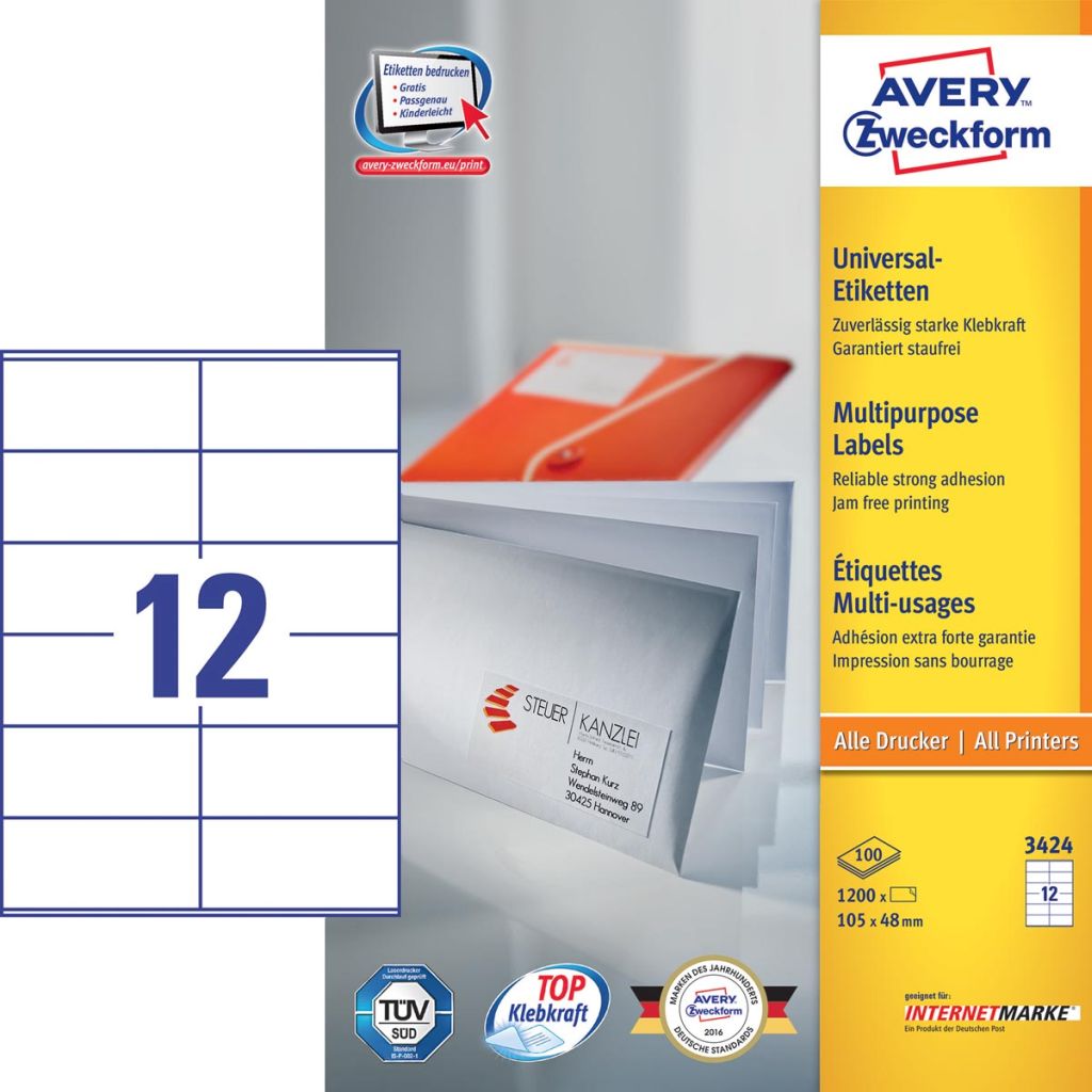 - Specificaties: Quickpeel: eenvoudig etiketten verwijderen van het blad Voor kopieermachines, laser- en inkjetprinters Met rechte hoeken Ft 21 x 29,7 cm (A4) FSC-gecertificeerd ft 105 x 48 mm, 1.200 stuks, 12 per vel, doos van 100 vel